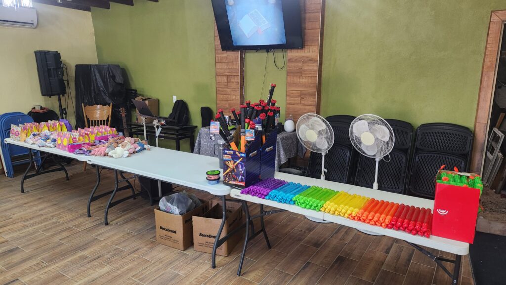Inside the community center, the games and prizes are setup and food is prepared.