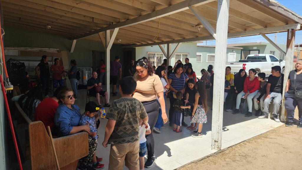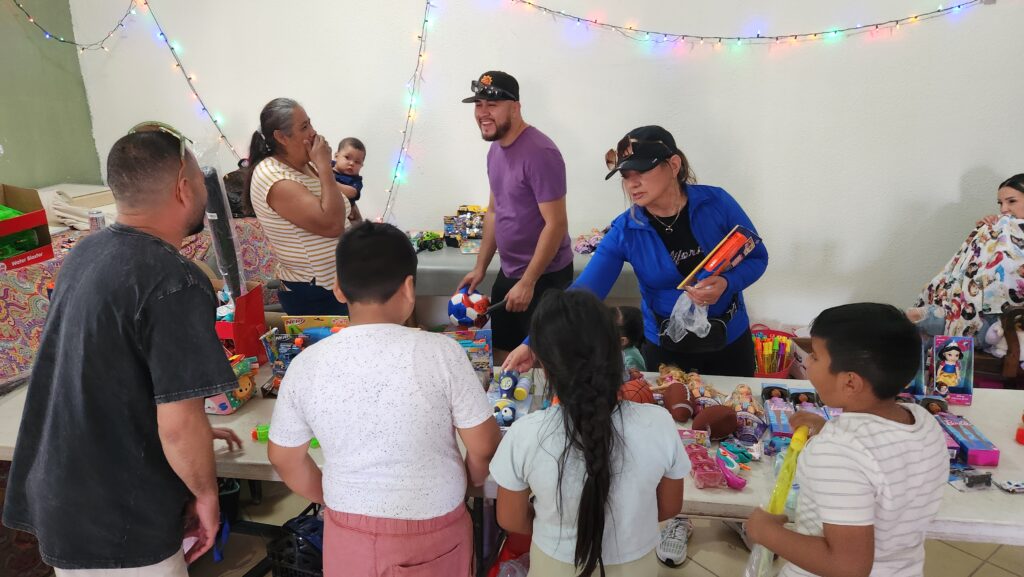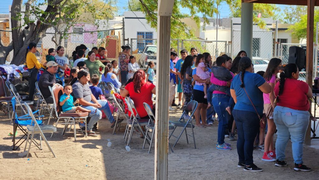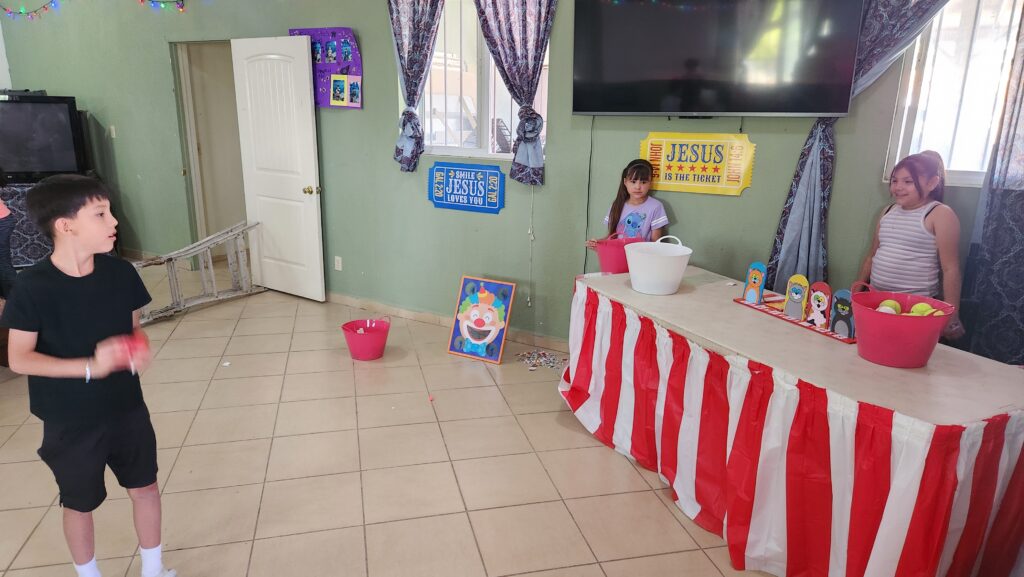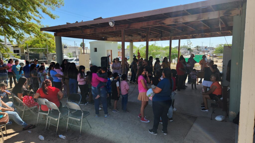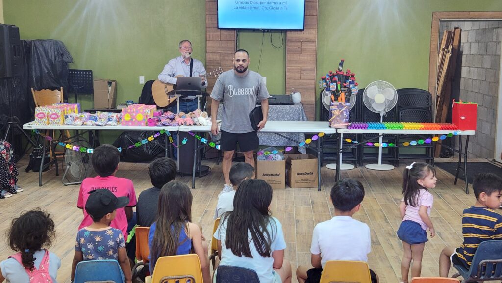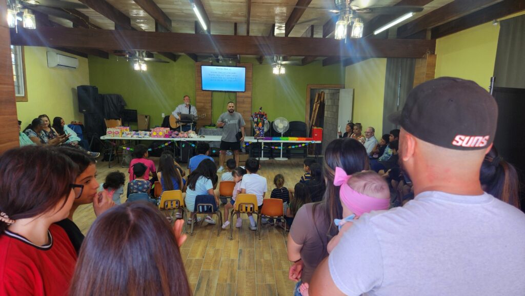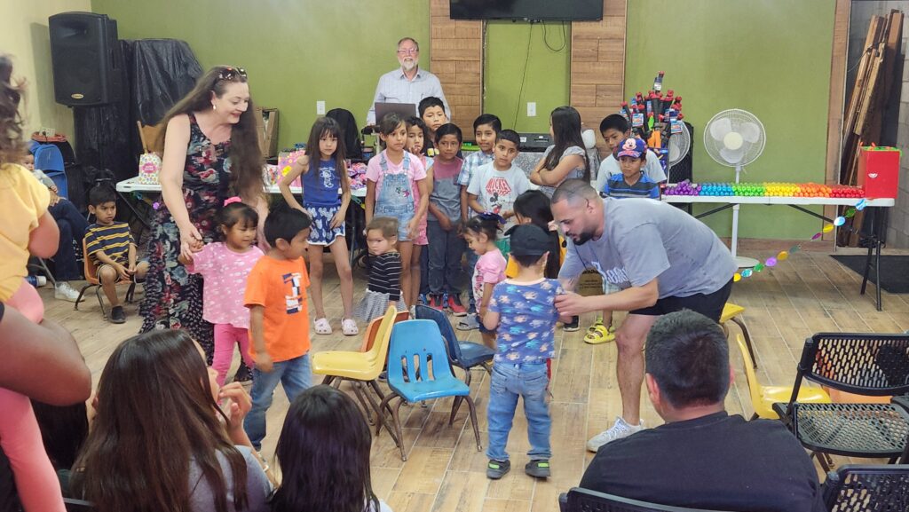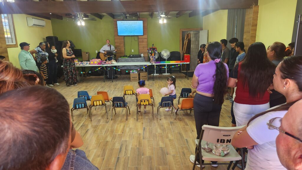 The church begins to fill with kids and their families. Joel played some music, Sam talked with them for a few minutes, musical chairs was played, and toys were handed out.