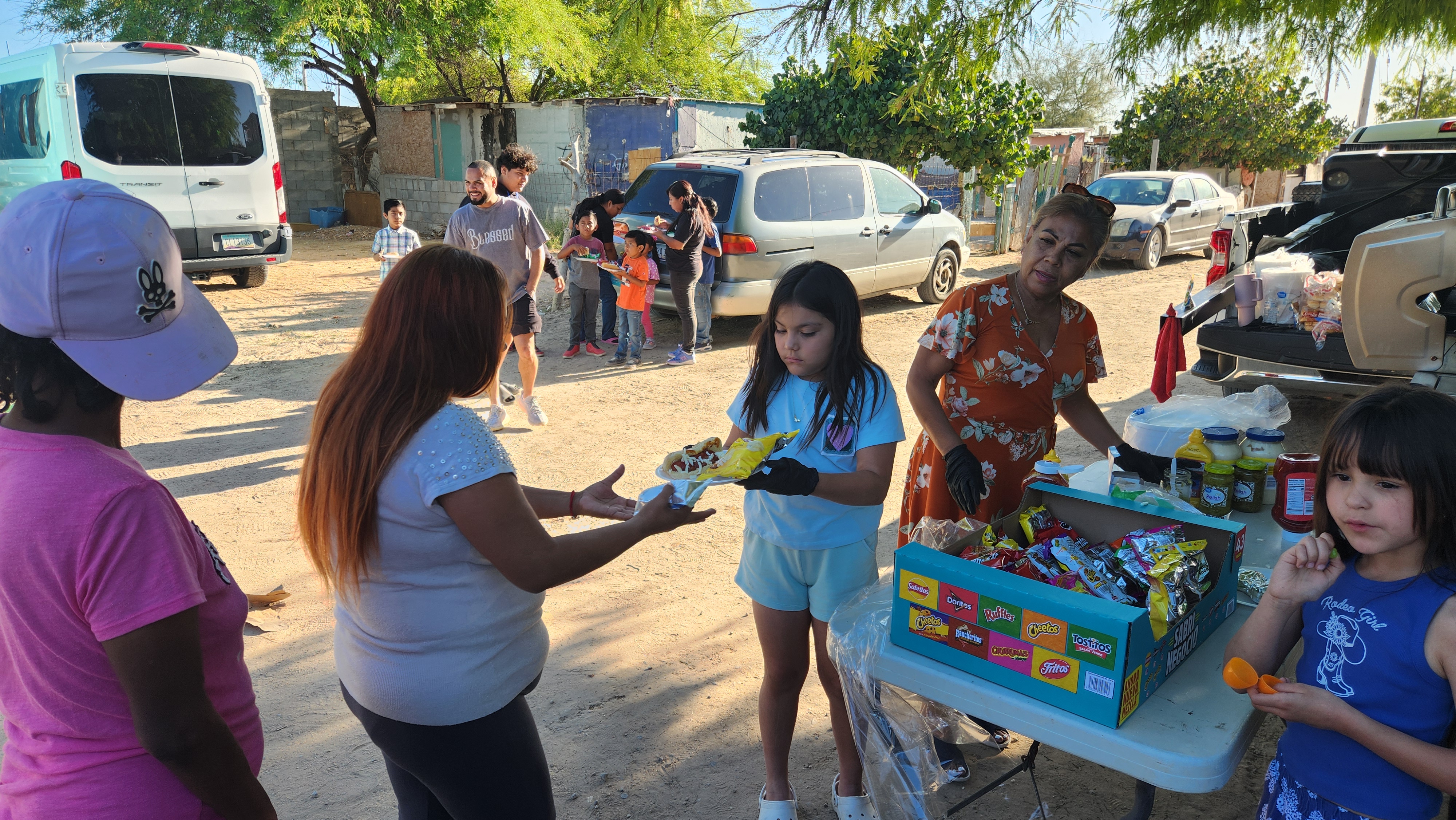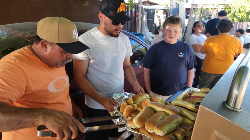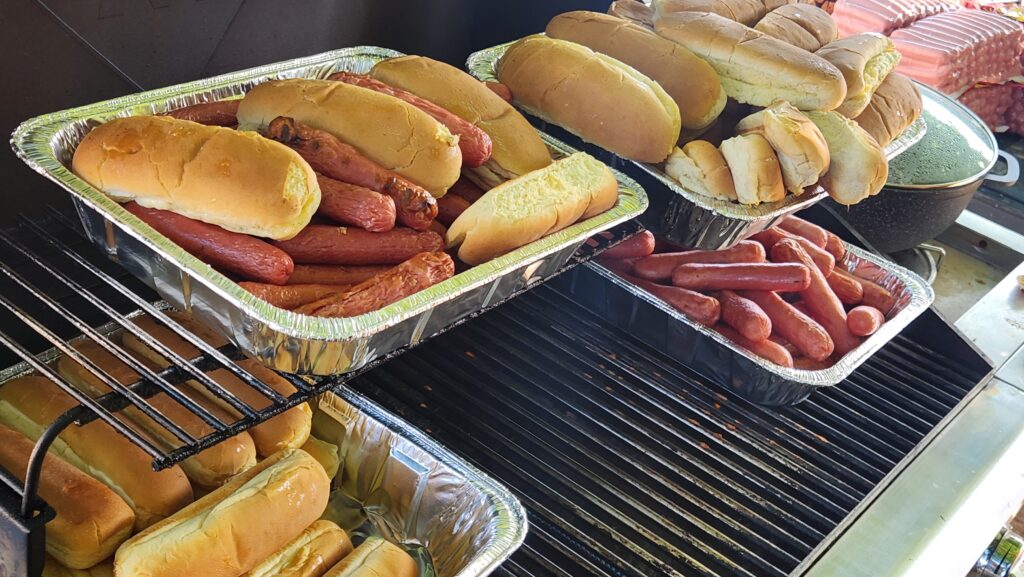 The crew arrives at the railroad tracks church and began setting up, unloading the vehicles, and grilling hot dogs.