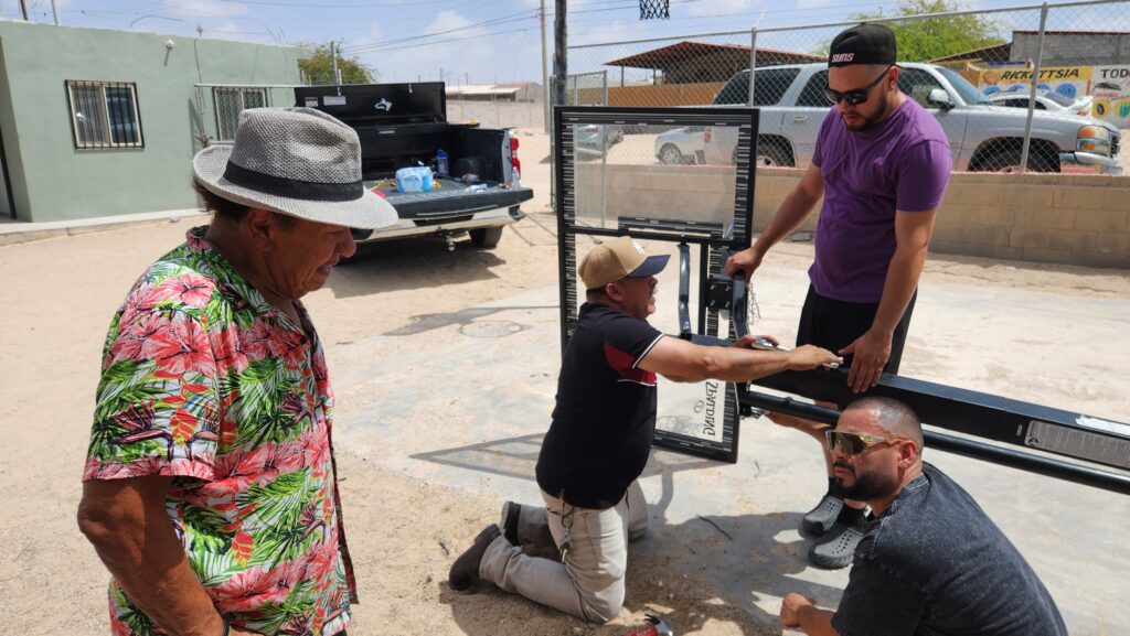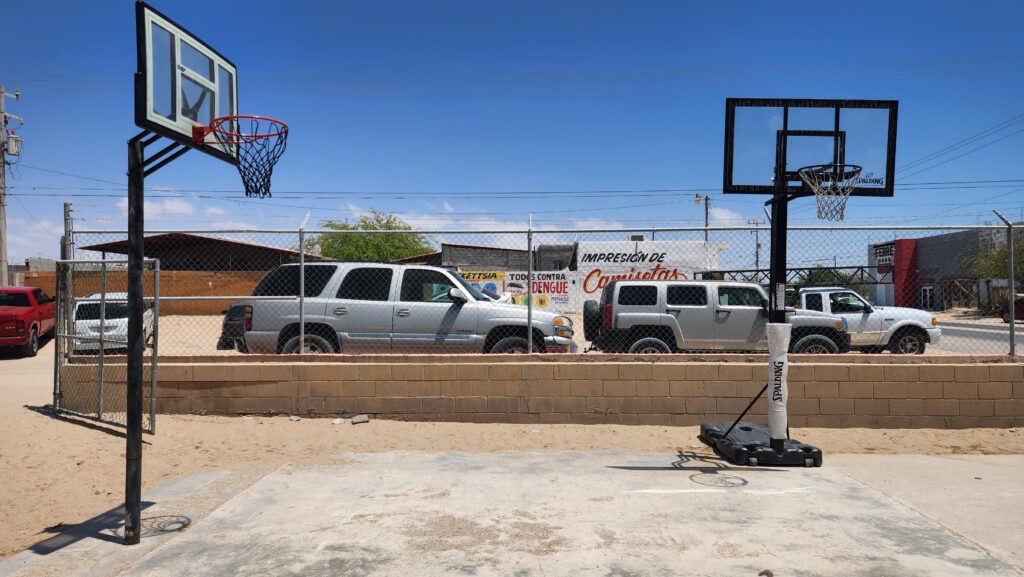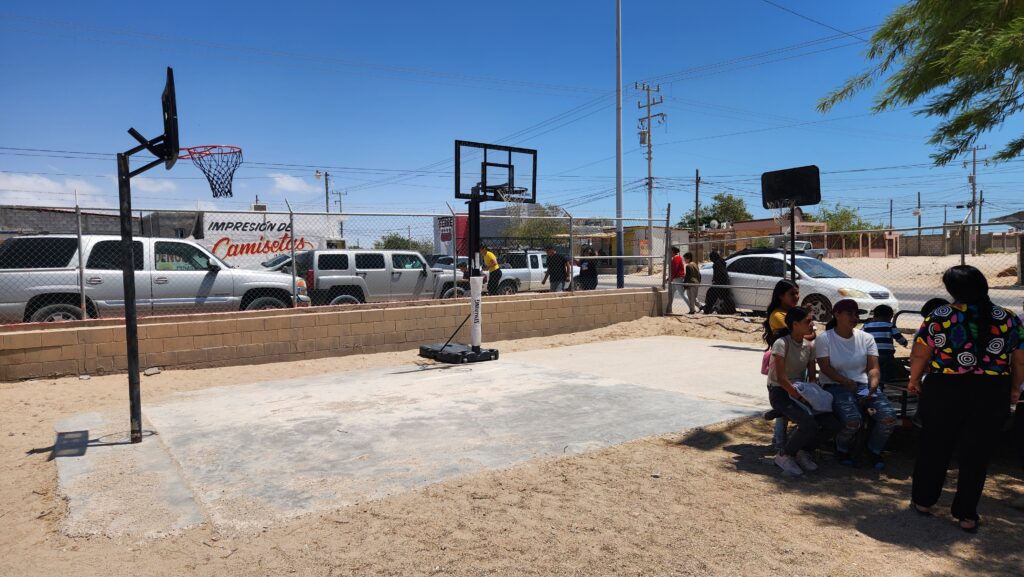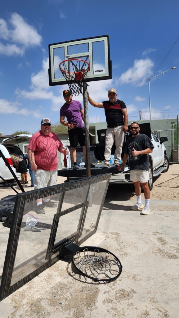 Several of the guys worked hard on upgrading the dilapidated basketball court. A new backboard and hoop was installed on the existing pole. Then, another portable hoop was reassembled and setup for the kids to play. Jay, Dave, and a few others supervise the work.