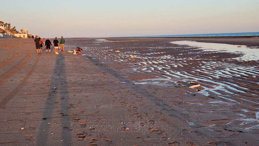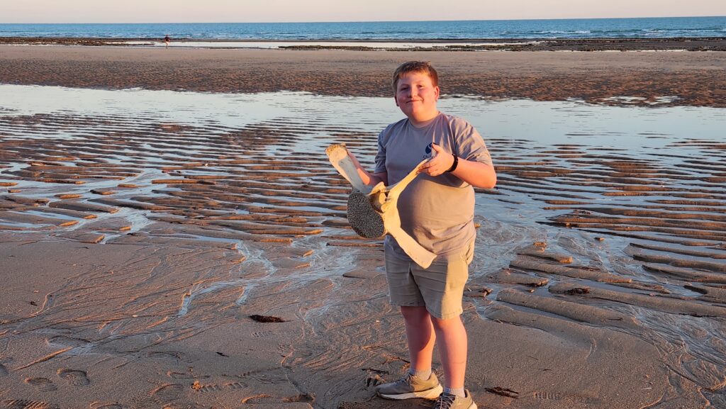 Everyone was heading down the beach to see the remains of a dead whale that had washed up. Evan was able to hold up a vertebrae and rib bone that were scattered along the beach.